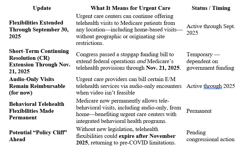 What this means: Urgent care operators should not assume telehealth coverage is “locked in.” The timeline for permanent Medicare reform is now uncertain.